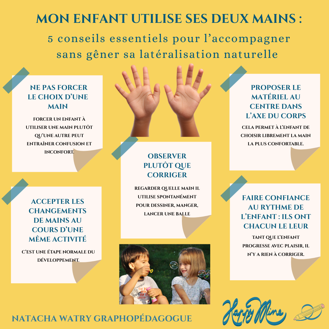 Une bonne nouvelle : Il n'y a pas de "bonne main"! Le cerveau de votre enfant saura naturellement quelle sera sa main dominante. Quelques bons gestes et une observation attentive vous guidera pour ne pas entraver le bon développement de votre enfant qui saura quelle main priorisée en fonction de son activité.